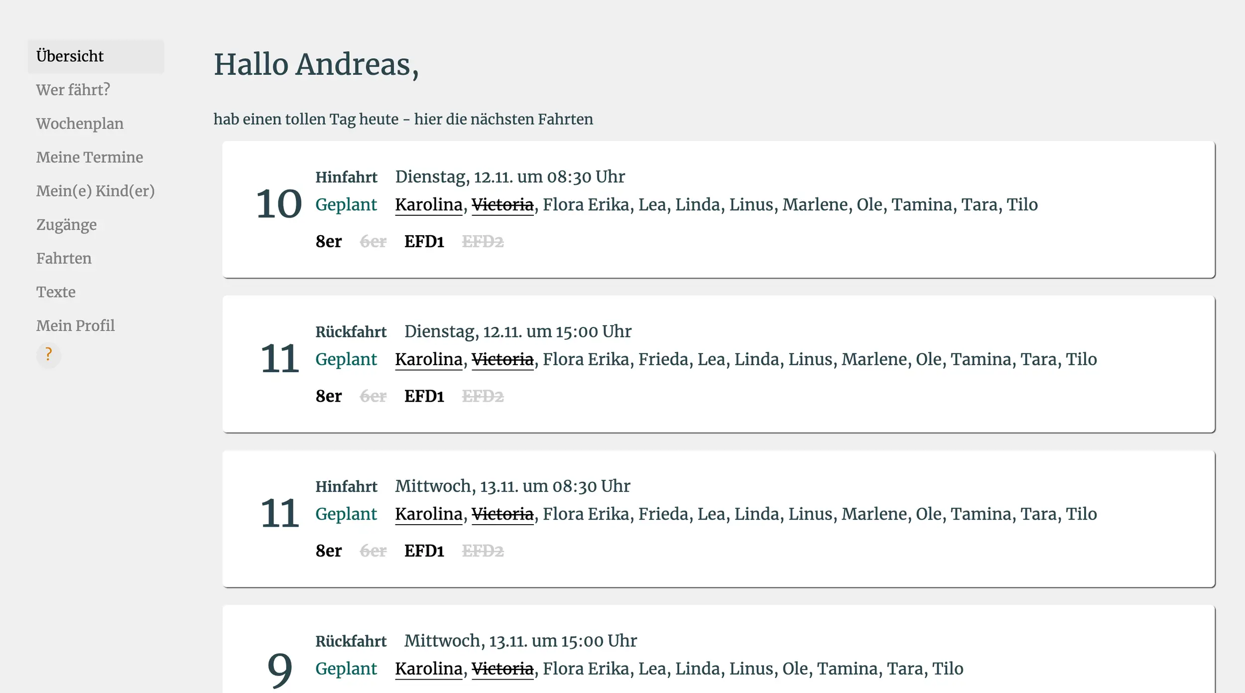 Die Anwendung weiß, welches Kind an welchem Datum fährt oder nicht und welche Transportmittel benötigt werden.